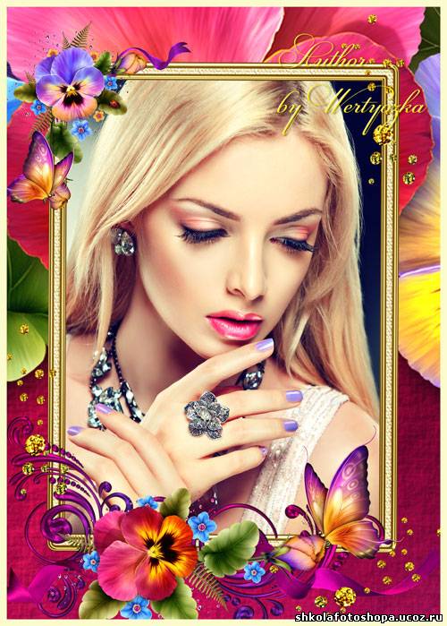 Женская рамка для фото с яркими цветочками - Анютины глазки PSD | 4077x5700 | 300 dpi | 56 Mb Автор: wertyozka